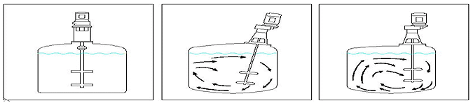 凡將攪拌器自攪拌槽之頂部插浸於槽內(nèi)攪拌者謂之頂插法,可分為中心插浸(圖A)、偏心插浸(圖B)及偏心斜插(圖C)等三種。
