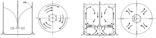 A. 中心插浸在低黏度且無擋板阻流之操作時,液體會產(chǎn)生打旋現(xiàn)象(圖D),攪拌速度越快則打旋越強(qiáng)烈,此種混合效率最低,通常系加裝擋板加以消除(圖E),在直立槽內(nèi)加裝四個直立標(biāo)準(zhǔn)擋板組,板寬約槽直徑之1/10~1/12左右,由於進(jìn)一步增加板寬時并未發(fā)現(xiàn)動力增加,故由輪葉動力消耗觀點(diǎn)看,此項(xiàng)寬度并不能視為標(biāo)準(zhǔn)之板寬,因?yàn)閷?shí)驗(yàn)證明發(fā)現(xiàn),板寬范圍有助於流體上下打混,并消除渦流現(xiàn)象。但是板數(shù)增加時,動力消耗增加。當(dāng)液體黏度增加時,對擋板需求層度隨之降低,板寬隨之減小,擋板可與槽壁保留適度之空隙讓流體穿過,而不至於產(chǎn)生滯留現(xiàn)象,更高黏度之液體則可采用斜角度方式安裝。